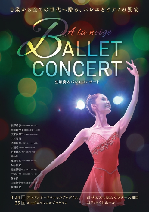 0歳からの未就学児も鑑賞可能なピアノ生演奏による「生演奏&バレエコンサート」を今夏も渋谷区文化総合センター大和田さくらホールにて開催します! 普段劇場に入場することが出来ない未就学児のお子様にも大人の皆さまにも「本物を身近に体験してほしい」との思いから生まれた本格バレエコンサートです。物語を感じていただける選りすぐりの作品と生の音楽に拘り、全演目ピアノ生演奏に乗せてお届けいたします!コンサートを彩るのは、素晴らしいプロフェッショナルで個性豊かなダンサー&ピアニスト!!新国立劇場バレエ団の池田理沙子や山田悠貴、YouTubeでも大人気の益子倭などによる”本物のパフォーマンス”をぜひお楽しみください!