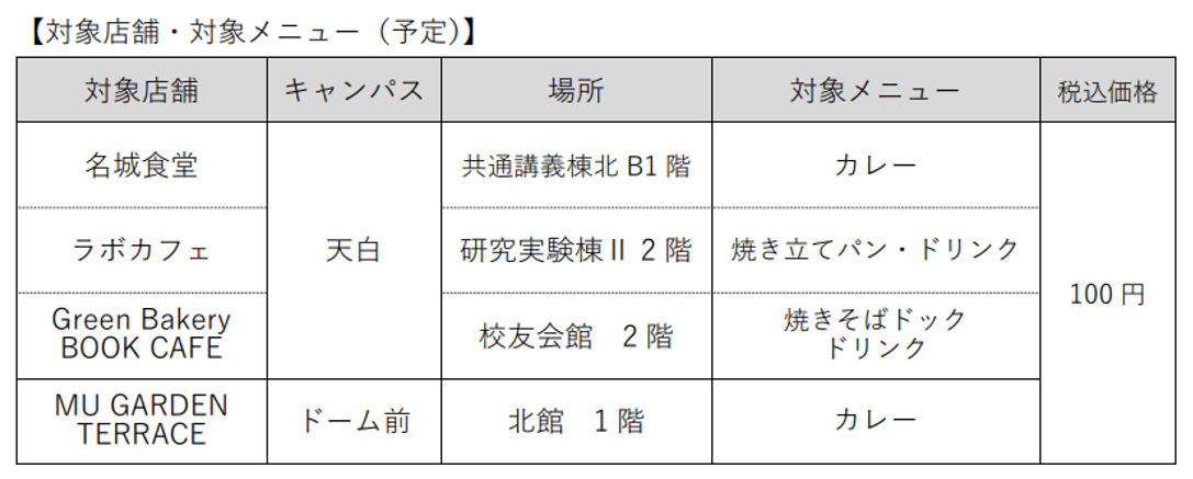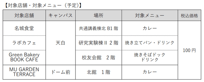 ・280 円分のメニューを「100 円朝食」として提供。差額は寄付金(名城大学教育振興資金)から補填。