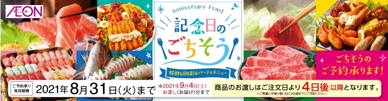 いつでも誰かの特別な日だから「記念日のごちそう」で大切な人の特別な日の食卓を彩りませんか。お寿司やオードブル、ケーキなどイオンがご予約承ります。