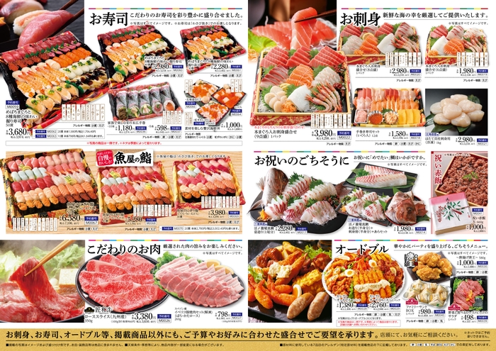 また店頭ではお刺身・お寿司・オードブル等、カタログ掲載商品以外にも、ご予算やお好みに合わせた盛合せでご要望を承ります。(ネットスーパーではご要望は承っていません)