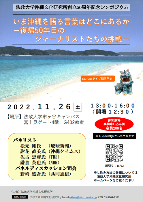 法政大学沖縄文化研究所は、創立50周年記念プロジェクトのひとつとして、シンポジウム「いま沖縄を語る言葉はどこにあるか―復帰50年目のジャーナリストたちの挑戦―」を11月26日(土)に法政大学市ケ谷キャンパスで開催、YouTubeで同時配信します。