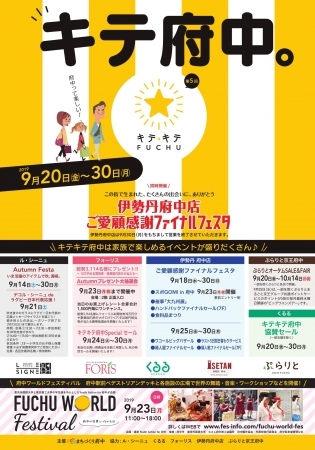 9月20日(金)~9月30日(月)までの11日間、府中駅前の商業施設(ル・シーニュ、伊勢丹府中店、フォーリス、くるる、ぷらりと京王府中)が、合同でセールを行います。おトクに食事やお買い物が楽しめるこの期間に、府中にキテキテ!