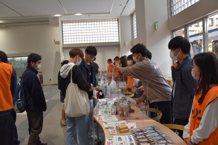 販売ブースには、岩手県の持ち歩く羊羹やしいたけの菌床、熊本県の栗んとうなど、ユニークな商品が数多く並べられ、通りがかった学生や教職員は興味深そうに足をとめて商品を眺めていました。学生たちのおすすめはしいたけの菌床。しいたけを育て、収穫する楽しみをぜひ体験してほしいとのことでした。