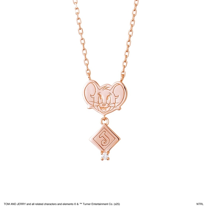 ピンクゴールドカラーで表現した笑顔がキュートなジェリーのフェイスモチーフに、イニシャルプレートが揺れるデザイン。ワンポイントのストーンが胸元でキラリと輝きます。