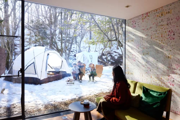 キャンプサイトは、1秒アクセスが可能な客室のガーデンに用意します。客室からキャンプサイトを確認できるので、客室の中にいながら、キャンプを楽しむ家族の姿を眺めるなど、ゆっくりと過ごすことも可能です。焚き火で焼いて楽しむマシュマロや大人には燻製のおつまみセットを用意します。ホットワインやミルクなどのドリンクもあるため、外でもほっこりとあたたまりながらキャンプ体験ができます。日中は家族みんなで遊び、子供が休んだ後はそっと外に出て、大人だけの時間を楽しむなど、子供も大人も自由な楽しみ方ができます。