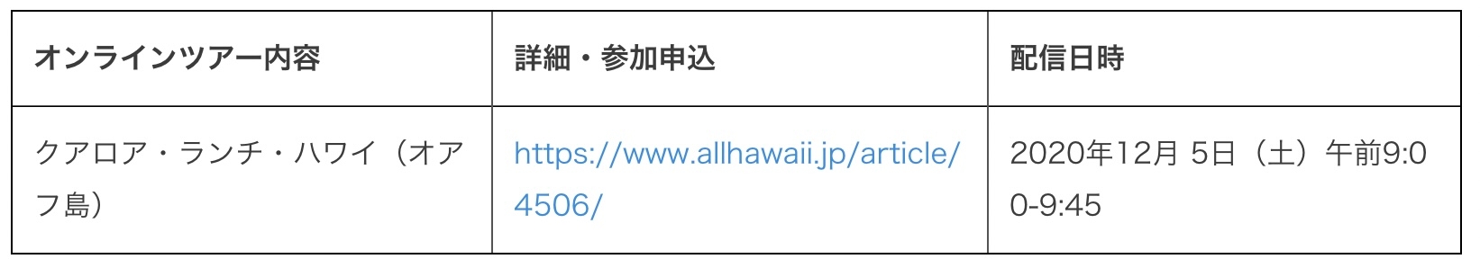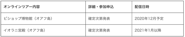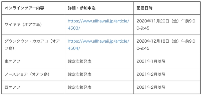 *上記プログラム内容は、2020年11月13日時点の内容です。今後、配信日時や追加ツアーが決まり次第公式ポータルサイトallhawaii内にて随時更新します。