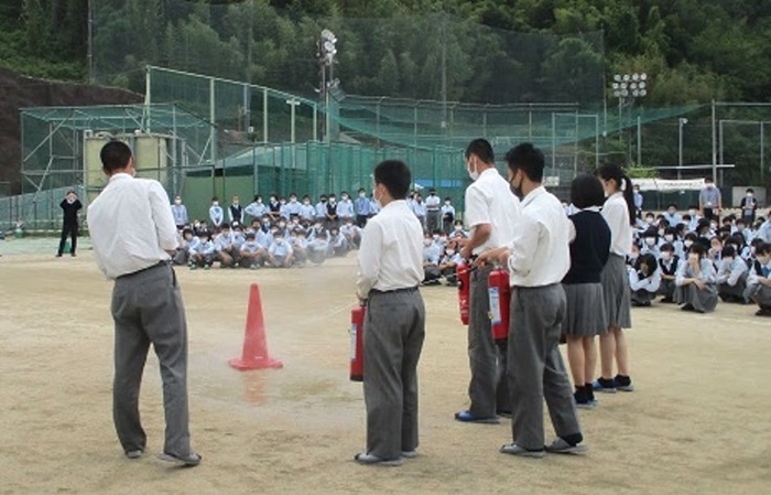 また、福山地区消防組合消防局南消防署瀬戸出張所の方をお招きし、避難を迅速に行う方法や初期消火における消火器(水消火器)の使い方などを学んで、災害への対応力を身につけます。