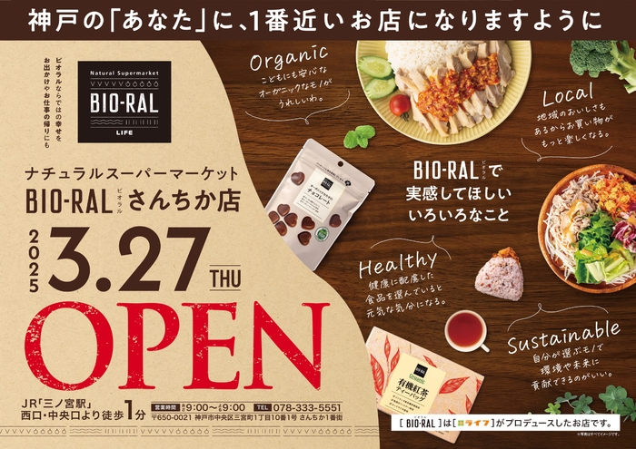 「ビオラルさんちか店」では、駅直結型の特性を活かして、近畿圏のビオラルでは初となる対面のお惣菜コーナーを設置し、プライベートブランド「BIO-RAL」や食品添加物に配慮した原料を使用した彩り豊かなお惣菜をご提供いたします。また、「神戸洋藝菓子ボックサン」や「淡路島ばぁむ」など、一部のコーナーで地元・兵庫県や神戸市でつくられた商品を取り扱いいたします。高まる健康志向や安全・安心へのニーズにお応えし、お客様の心と体の健康と豊かな毎日のお手伝いができるよう、従業員一同でお客様をお迎えする準備を進めておりますので、オープンまでどうぞお楽しみにお待ちください。