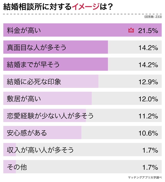 ・結婚相談所のイメージは、「料金が高い」「真面目な人が多い」「結婚までが早そう」