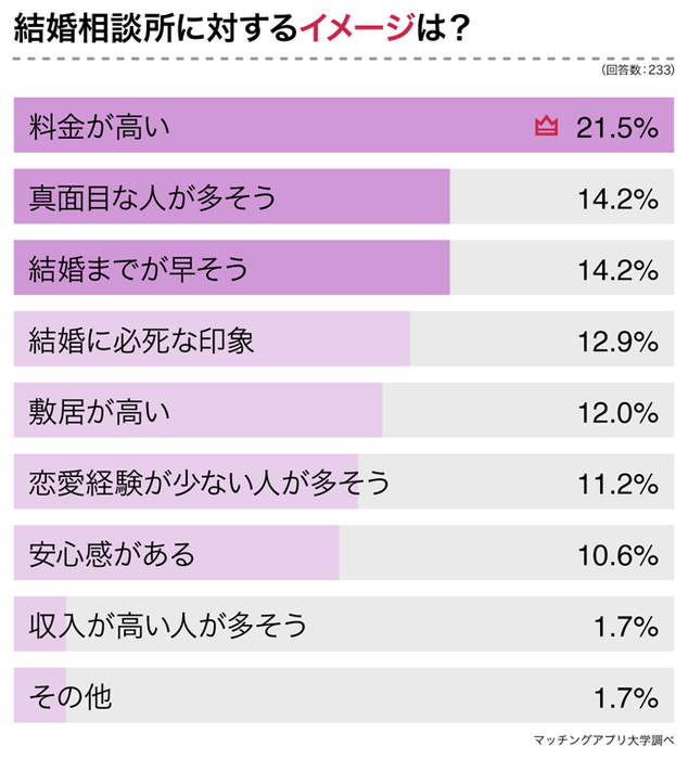 今回の調査は、結婚相談所を利用したことがない男女233人にアンケートを実施しました。その結果、以下のことがわかりました。
