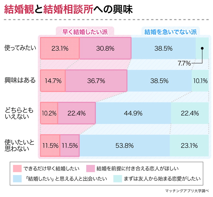 早めに結婚したい派である「できるだけ早く結婚したい」「結婚を前提に付き合える恋人がほしい」に関しては、使ってみたい(合計53.8%)・興味はある(合計51.4%)という回答のほうが、どちらともいえない(合計32.7%)・使いたいと思わない(23.1%)という回答よりも割合が高くなっています。