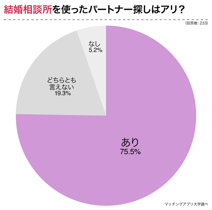 その結果、パートナー探しとしての結婚相談所の利用は「あり」と回答した人がもっとも多く、75.5%でした。「どちらとも言えない」が19.3%、「なし」が5.2%です。