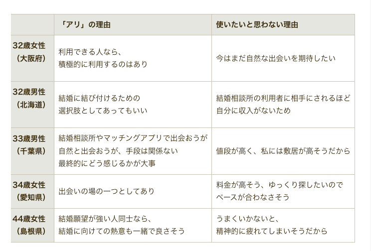 こうして比べてみると、「結婚相談所はパートナー探しとしてアリ」という回答は「一般的に婚活としてどうなのか?」という観点での回答となっており、「使いたいと思わない理由」は「実際に自分が婚活として活用するとしたらどうなのか?」という観点になっていることがわかります。