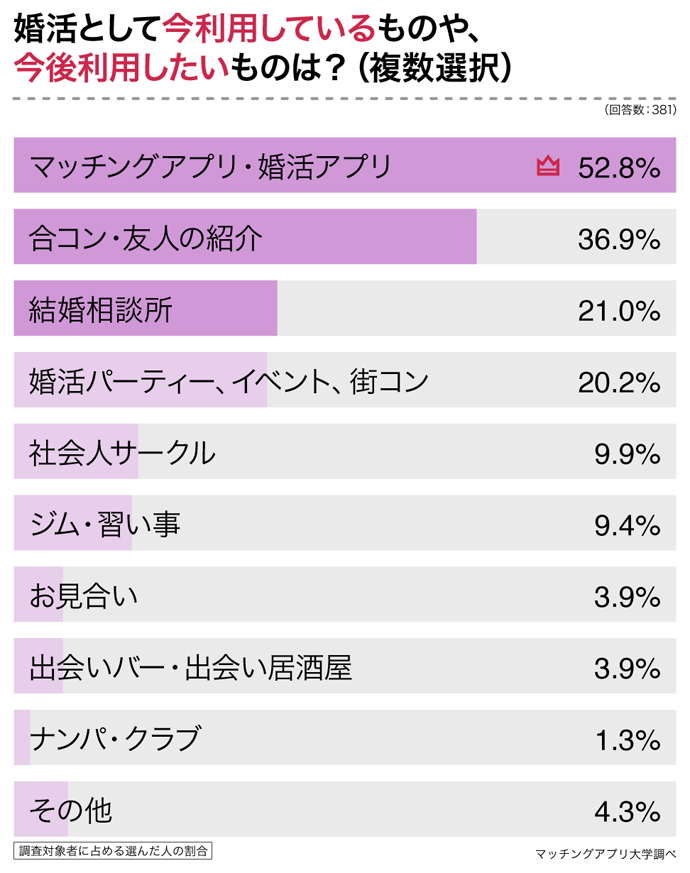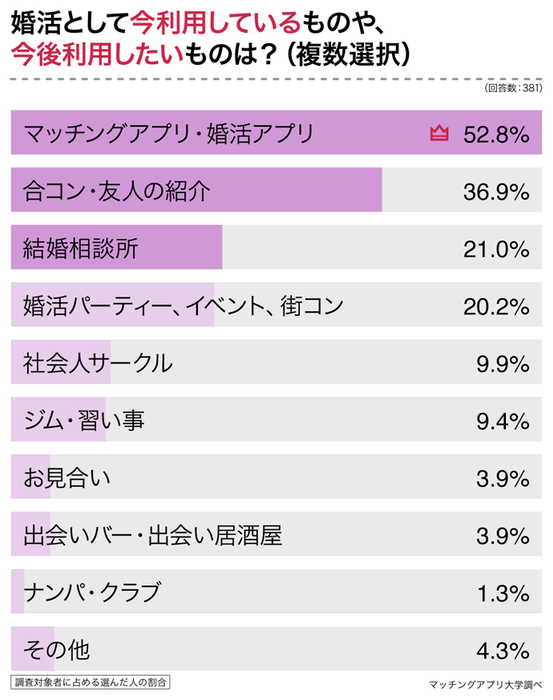 こちらも、最も多かったのは「マッチングアプリ」で52.8%でした。2番目に多かったのも過去に使用した婚活と同じ「合コン・友人の紹介」の36.9%ですが、その差は15.9ポイントと先ほどよりも開いています。