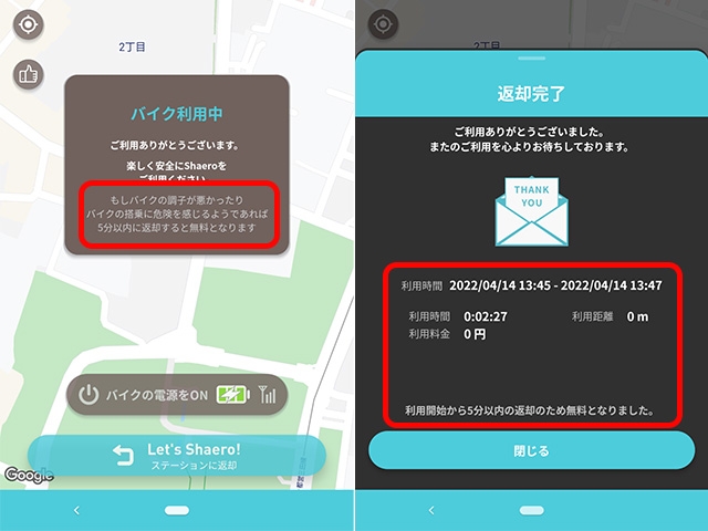 これにより、もしShaeroバイクに乗車した直後に機体の不具合が見つかった場合などに、ロック解除から5分以内に返却頂ければ、料金が自動的に0円になります。