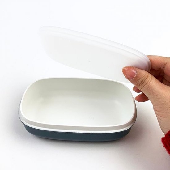 長方形ですが角は丸みがあって、かわいらしいフォルム♪ホワイト×ネイビーのバイカラーで、とってもシンプルなお弁当箱です。