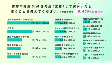 格安SIMを利用して良かったと思ったポイントについてのアンケート調査を実施したところ、「月額料金が安くなった」がもっとも多く全体の34.37%を占めました。「その他:20.58%」が2位になりましたが、3位~6位は僅差で「通話の品質がよかった:11.79%」「家族割があった:10.82%」「十分にGB数を使えた:10.77%」「通信速度が速かった:10.71%」という結果に。