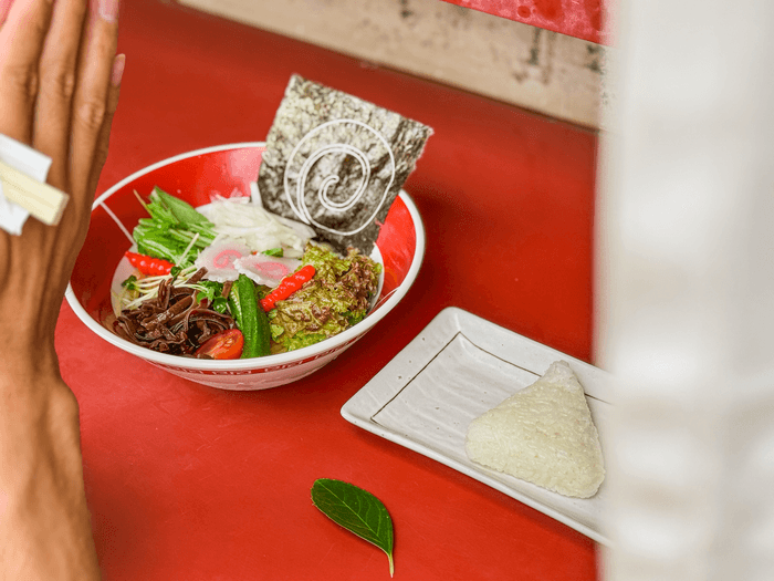 冷たいスープに、ヘルシーなこんにゃく麺と野菜がたっぷりの夏にピッタリの一品。さらに、今年は暑い夏を乗り越えるために、体力回復の“塩おにぎり”が1個付きます。