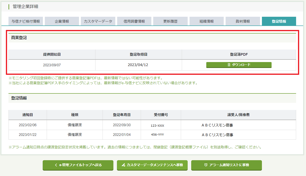 商業登記簿に記載されている商号、所在地、資本金、代表者などの変化をメールでお知らせします。企業の変更理由をホームページ等で確認したり、取引先に直接問い合わせたりすることで、その企業の経営方針を理解し、信用力判定に役立てることができます。また、債権譲渡登記情報もメールでお知らせしますので、取引先の資金繰り面での評価に役立てることも可能です。