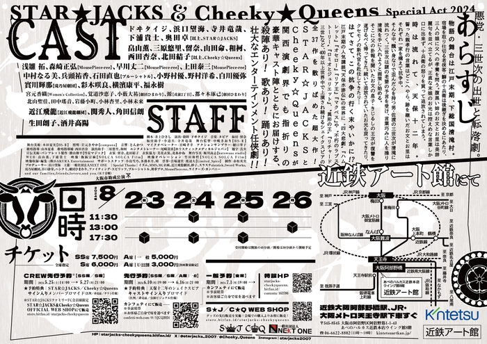 STAR☆JACKS/Cheeky☆Queensメンバーのほか、格闘家・俳優・歌手などマルチに活躍する角田信朗、京都発ノンバーバルシアター『GEAR-ギア-』でドールを務める兵頭祐香、元たこやきレインボー・彩木咲良、ブルーシャトルプロデュース・石田直也、大衆演劇界の"異端児"・近江飛龍など、関西演劇界でも指折りの豪華キャスト陣が集いました。