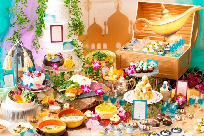 ジャスミンシフォン・魔法の絨毯タルト・ホワイトチョコとルバーブのケーキ・ランプの魔人ムース・夜空のレアチーズケーキ・ピラミッドケーキ・宮殿ロール・満月のマンゴーアイス・オレンジシュークリーム・赤い果実のムース・星屑のショートケーキ・砂漠のタルト・アラビアンコーヒーゼリー・プディングアラビアン・砂漠のオアシスジュレ・魔法の宝石マカロン
