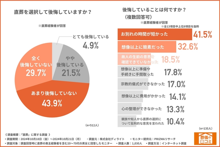 ・約3割の直葬を後悔する声には簡素さや時間の短さが想像以上だったという回答が上位に