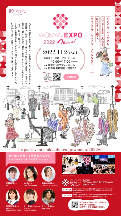 WOMAN EXPOは入場無料ですが、ご来場予定の皆様は公式サイトからのセミナー事前申込が必要 となります(→ https://events.nikkeibp.co.jp/woman/2022w/)。新着情報や、各種プログラムの詳 細、各社展示ブースの出展内容についても、公式サイトをご覧ください。