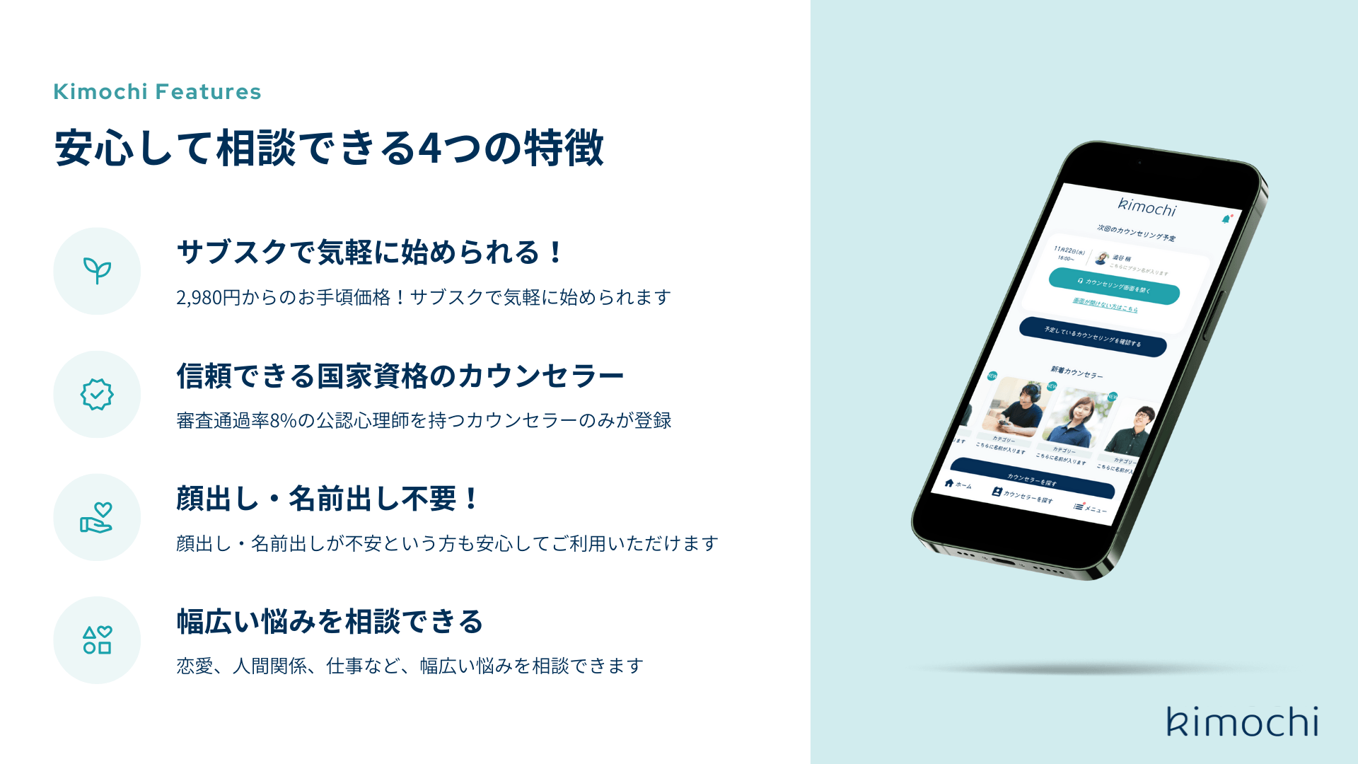 『Kimochi』では、心の専門家である公認心理師が一人ひとりの性格や特徴、悩みに合わせて、直接お悩みにお答えするオンラインカウンセリングを提供します。自宅などリラックスできる環境から、スマートフォンやパソコンを通じて簡単に利用できるため、忙しい方でも安心してご利用いただけます。