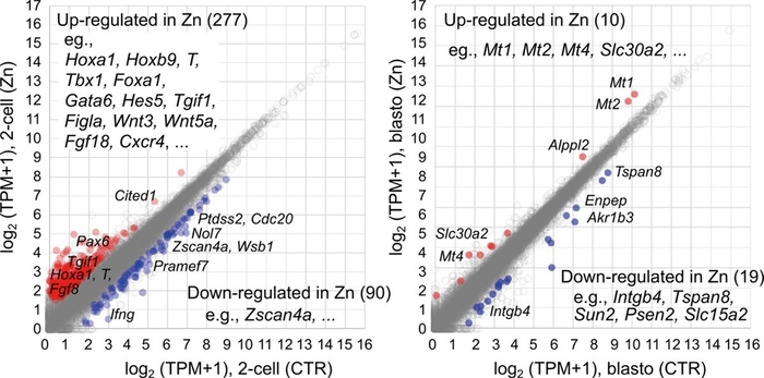 2細胞期(左)及び胚盤胞期(右)の、亜鉛に暴露した胚(Zn)と亜鉛に暴露していない胚(CTR)における遺伝子発現の散布図。亜鉛によって発現量が上昇した遺伝子は赤、発現量が低下した遺伝子は青で示している。代表的な遺伝子は図中に名称を示している。亜鉛に暴露すると、2細胞期では通常この時期に発現が認められない胎児の形態形成等に関与するHoxa1やHoxb9、T、Fgf8などの発現上昇や、胚性遺伝子の活性化に関与するZscan4aなどの発現低下が認められた。胚盤胞期では、金属イオンを制御するMt1やMt2、亜鉛のトランスポーターであるSlc30a2などの発現上昇が認められた。