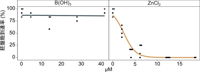 成分分析の結果、ガラスからはホウ素(B)や亜鉛(Zn)などが培養液に漏出していた。培養液にB(OH)3とZnCl2を添加して胚培養したところ、ZnCl2濃度依存的に発生率が低下した。