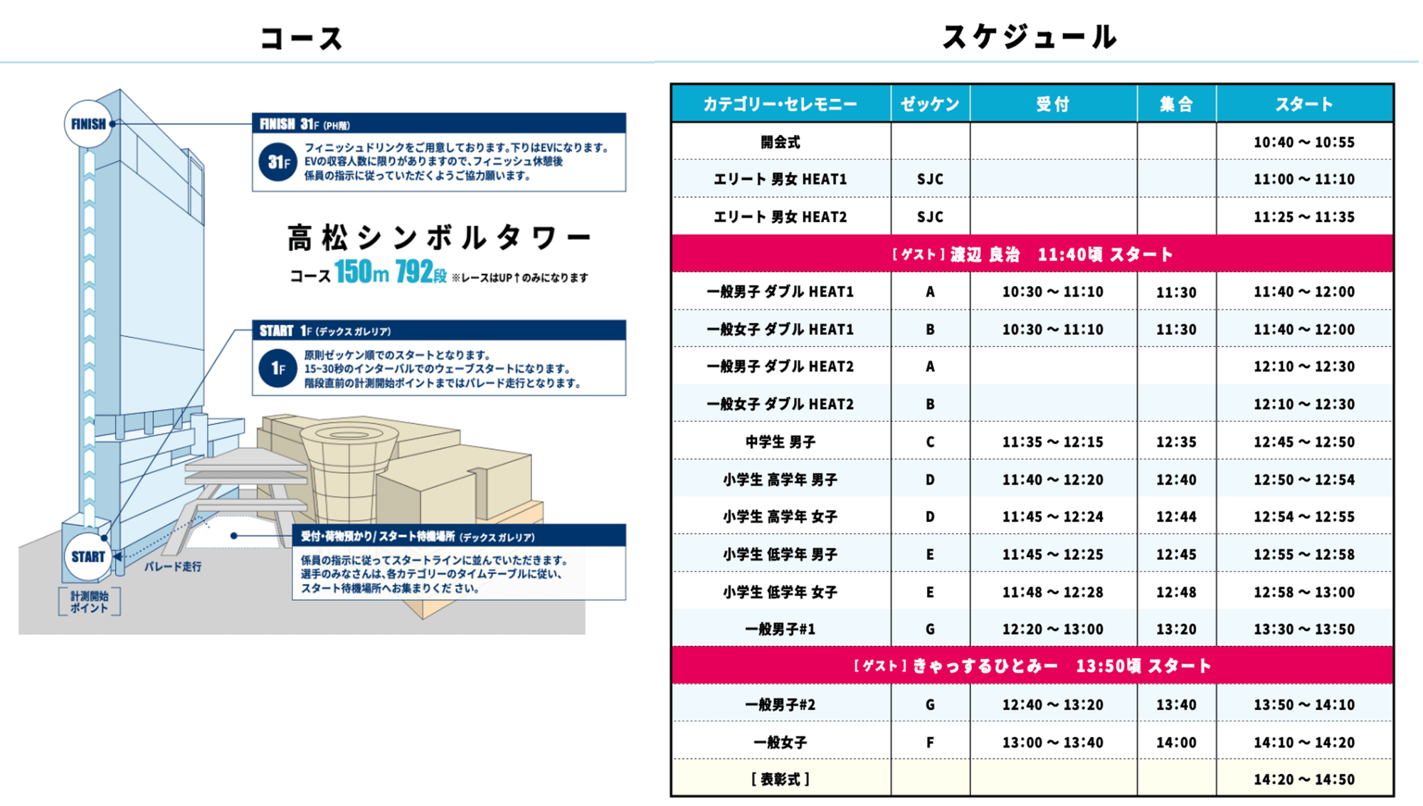 また、本競技(階段マラソン)は超高層ビルや高層タワーの頂上を目指して階段を駆け上がるタイムトライアルレースとなり、 本大会では選抜されたSJCエリート※と呼ばれる男子20名、女子10名が(名古屋、大阪、高松)の3会場で競い合い、各大会で獲得したポイントにて年間チャンピオンを決定する「STAIRCLIMBING JAPAN CIRCUIT 第3戦 高松大会」としても開催され、今シーズンの年間チャンピオンが決定いたしました。