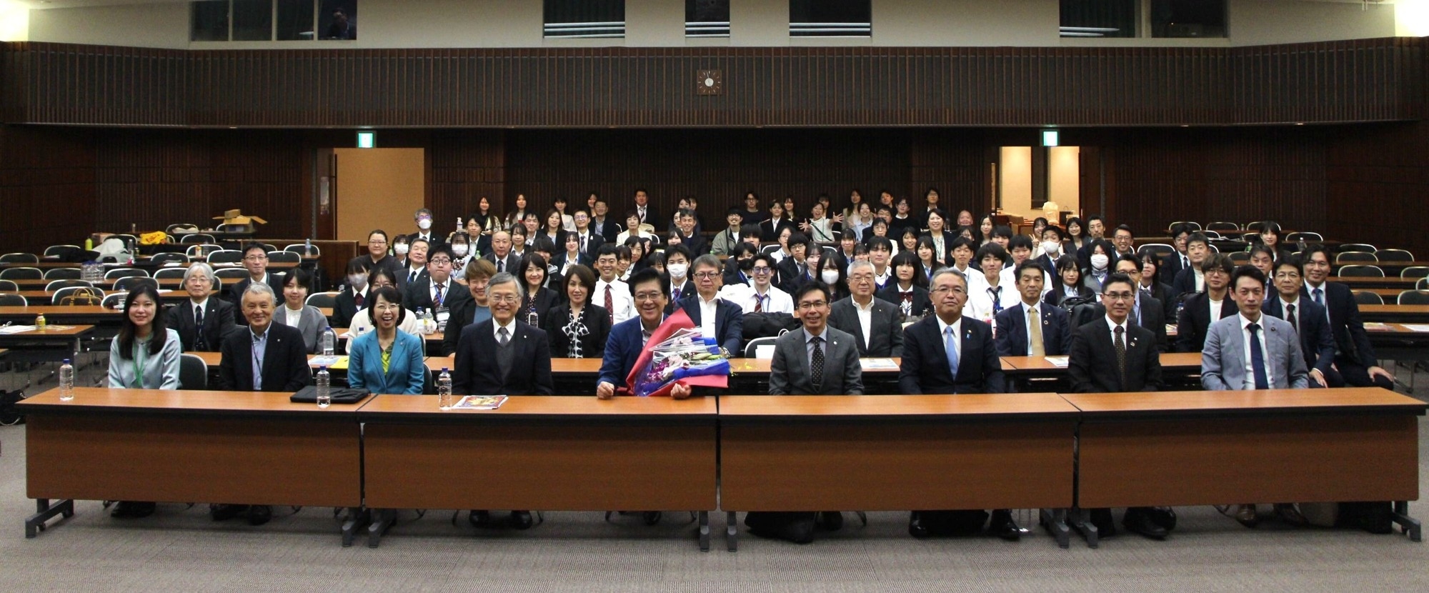 最後に、黒須里美副学長が御礼と統括の言葉を述べて閉会しました。「本日の素晴らしい発表にたどり着くまでに、多くの準備と支えがあったと思います。このドラマを支えてくださった自治体や先生方に深く感謝します。この機会を第一ステップとして、これからも麗澤大学と各自治体、そして高校生の皆さんと共に日本を明るくしていきましょう」と力強く締めくくられました。サプライズとして、4期16年にわたり市政を担い、今期で退任される黒田市長に花束が贈られ、参加者全員から温かい拍手が送られました。