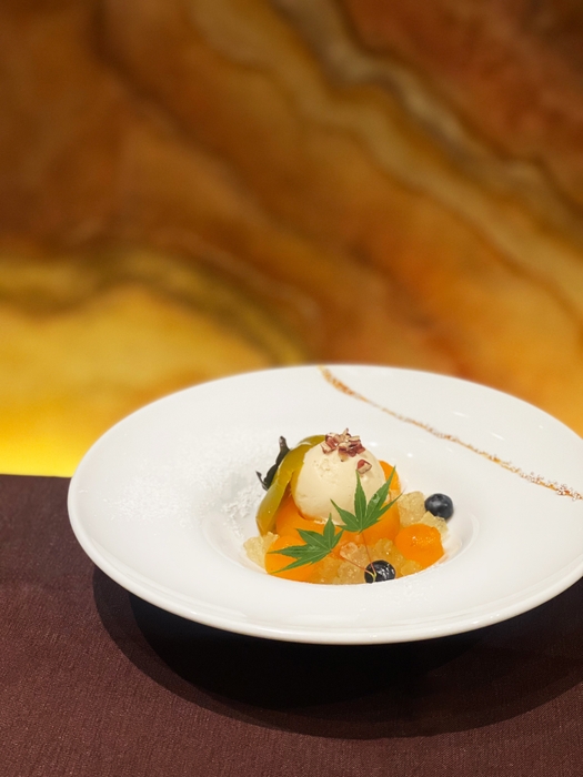 旬の柿を丸ごと丁寧にコンポートに仕上げ、コクのあるメープル香るウォールナッツジェラートと、ライムの清涼感が際立つ白ワインジュレを添えた、秋ならではの贅沢な一皿です。