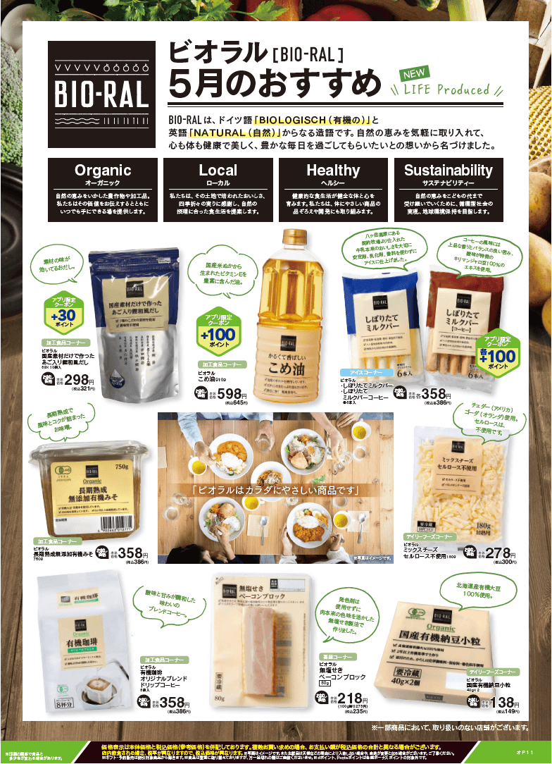 “おいしい” “ワクワク” “ハッピー” をお届けするライフコーポレーションは、健康志向のお客様におすすめしたいBIO-RAL(ビオラル)商品を、毎月お試し価格にて販売いたします。5月のおすすめは9品。その中より「国産有機納豆小粒」「長期熟成無添加有機みそ」「有機珈琲オリジナルブレンド」「こめ油」の4品をご紹介いたします。