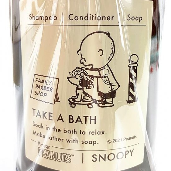 こちらは色違いのブラウンです。スヌーピーがチャーリーブラウンにシャンプーをして貰っている、楽しいデザインですよね。