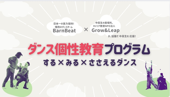 ぶつかったそのような課題を解決するために、私が所属するキャリア教育NPO法人Grow&Leapと日本一の女性二人組ダンスチームBarnBeatが協働で、「ダンス」への多様な関わり方を作っていくことを目的として、本プログラム「ダンス個性教育」を実施することになりました。