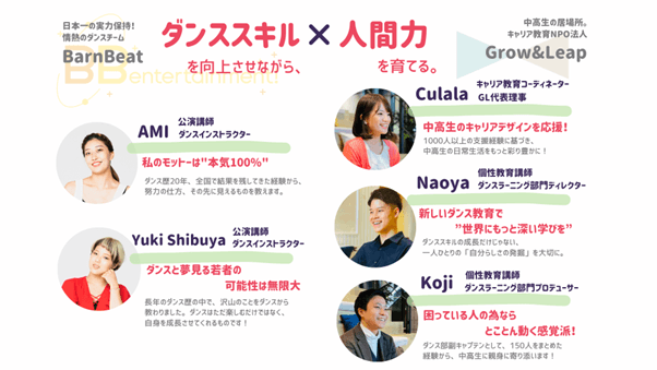 個性教育の「人間性の向上」を図る要素を、Grow&Leapが主に担当し、ダンススキルの教授は主にBarnBeatが担当しています。具体的には、倉田がコーディネーターとして受講生の将来の方向性を個別にサポート、石原と小島は個性教育講師として、プログラムの全体の指揮をし、自分らしさを引き出すためのマインドセットや振り返りを少人数制で実施しています。