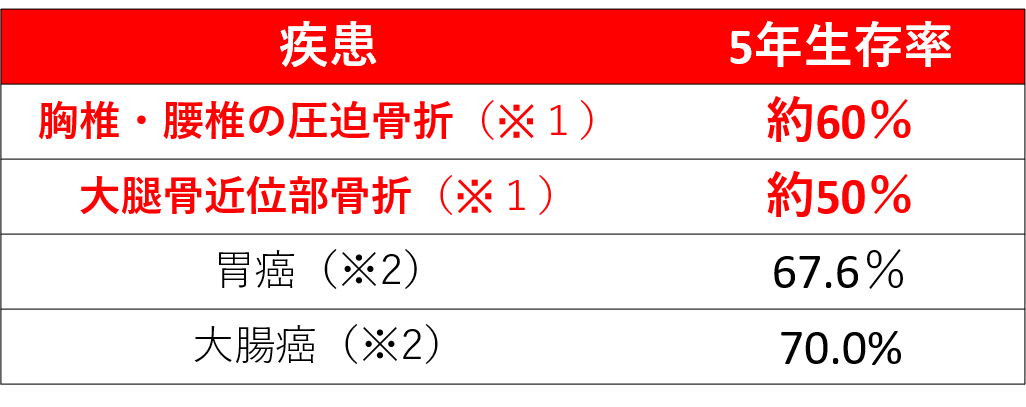 胃癌や大腸癌に罹患した場合、身体に深刻な影響が出ることは既に広く知られていることですが、骨粗鬆症による胸椎・腰椎の圧迫骨折(※1)や骨粗鬆症による大腿骨近位部骨折の5年生存率(※1)は、胃癌や大腸癌の5年生存率(※2)より低く、生命にとってより危険であることは、ほとんど知られていません。