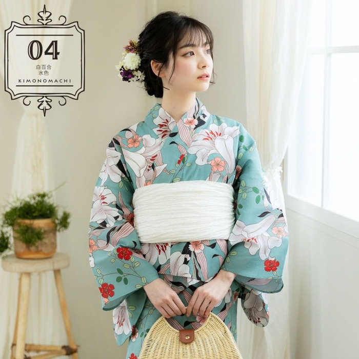 浴衣:ややグレイッシュな淡いターコイズ系の水色の地。チャコールの線で描かれた大きな百合の花に萩の葉、撫子の模様。白に淡い赤みのグレーのぼかしの百合の花、黒の影がアクセントになった淡いピンクの葉。緑と薄緑の萩、桃色や赤の撫子の小花が可愛らしさを添えます。