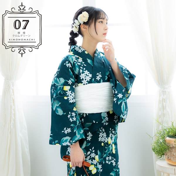 浴衣:暗めの青緑色の地に、花や実をつけたレモンの柄。浅い青緑と白緑色のぼかしの葉。白と淡いグレーの花。明るい黄色、白のつややかな実。レモンの瑞々しさを感じさせるデザインが、新鮮な魅力を放ちます。