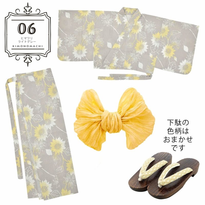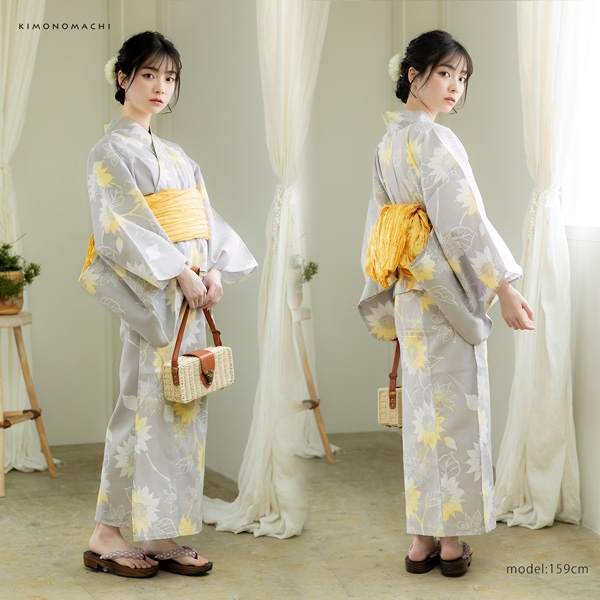 浴衣:明るいグレーの地に白抜きのヒマワリ。淡い黄色のぼかし。明るい色彩が爽やかで、茎を繋げたデザインが動きを生み出しています。