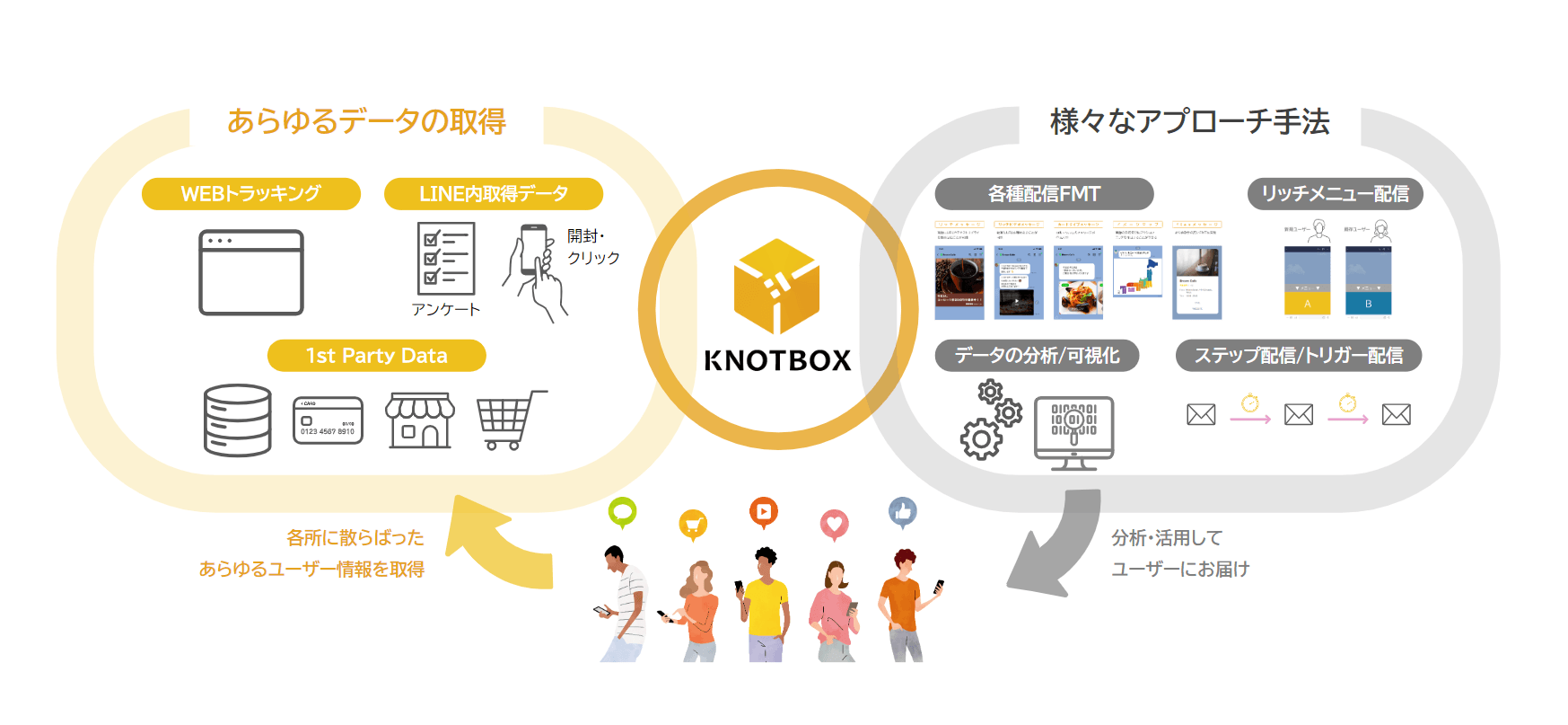 (※)KNOTBOXでは、ユーザーが許諾したデータのみを取得・活用いたします。取得したデータの取り扱いについては、KNTOBOXデータポリシーのとおりです。