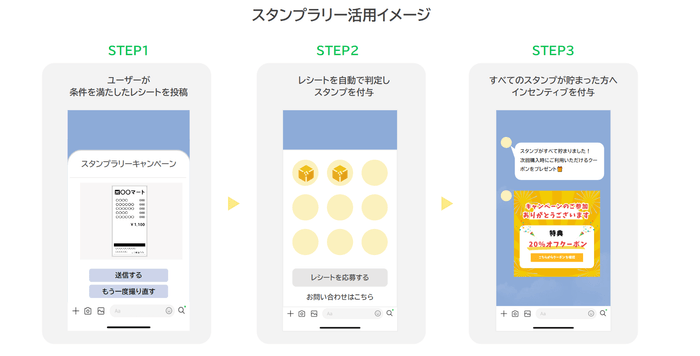 ユーザーは、店頭で対象商品を購入し、レシートをLINE上で投稿することでスタンプを獲得できます。