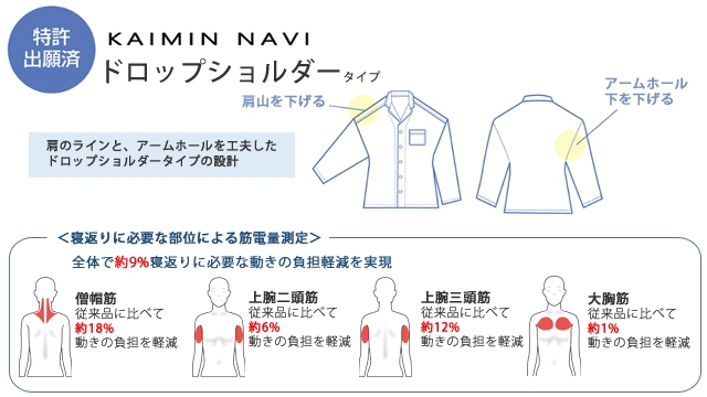 「KAIMIN NAVI」の寝返りしやすいパジャマは、質の高い眠りに重要とされる「寝返り」に着目。科学的検証を重ねて生まれた特許出願済の寝返り設計を採用したパジャマで、2020年秋に発売しました。肩のラインとアームホールの設計の工夫で背中・肩・腕を動かしやすくして寝返りに必要な動きの負担軽減と、腕の可動域が広くなることで腕をあげやすく なることを確認した寝返りしやすいパジャマです。
