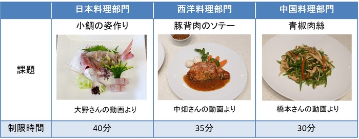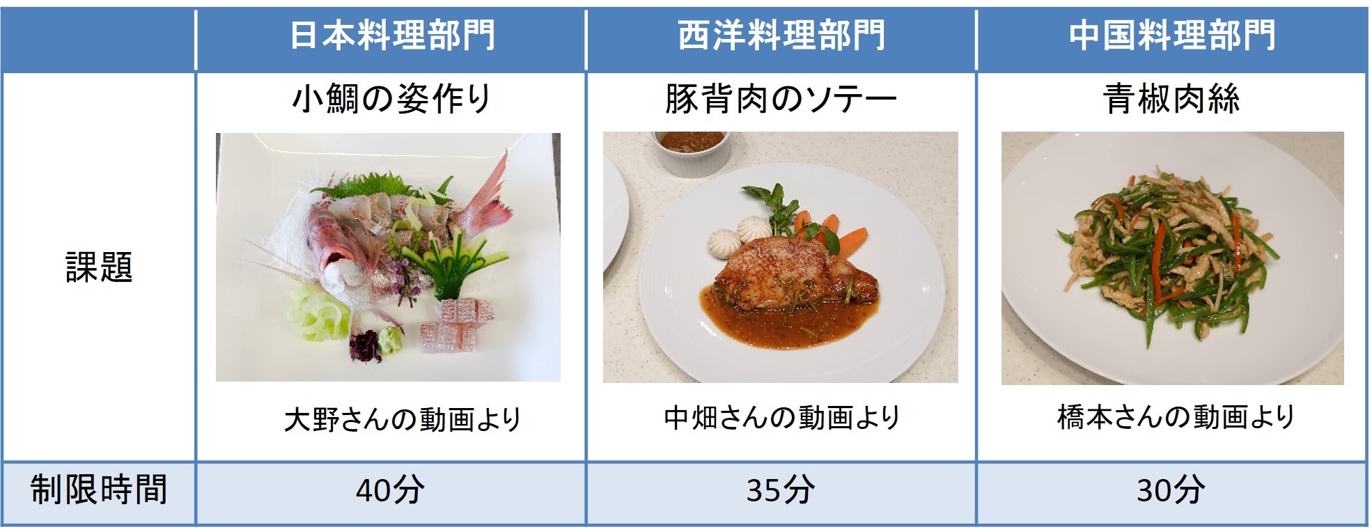 部門ごとに1作品。各調理師学校で、選手が制限時間以内に課題を調理する様子を2点のアングルから撮影し、その動画を提出。
