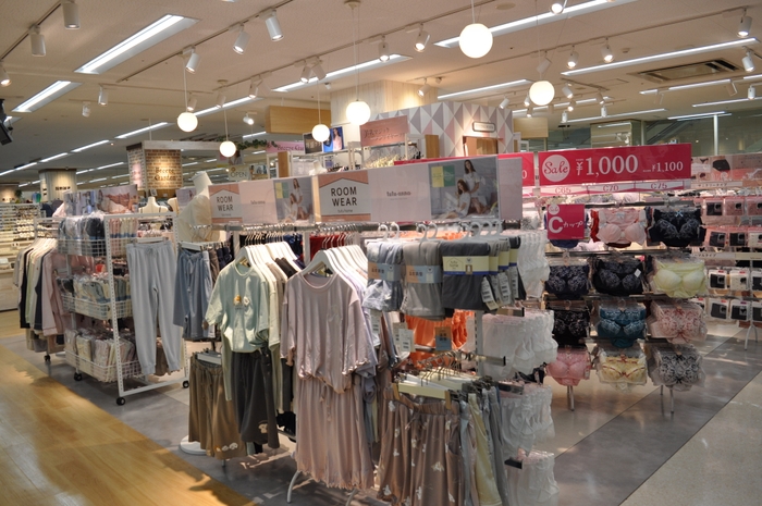 まるで専門店のような広々とした売り場で、有名ブランド「tutuanna」の靴下やパジャマ、肌着を種類豊富に取り扱いいたします。