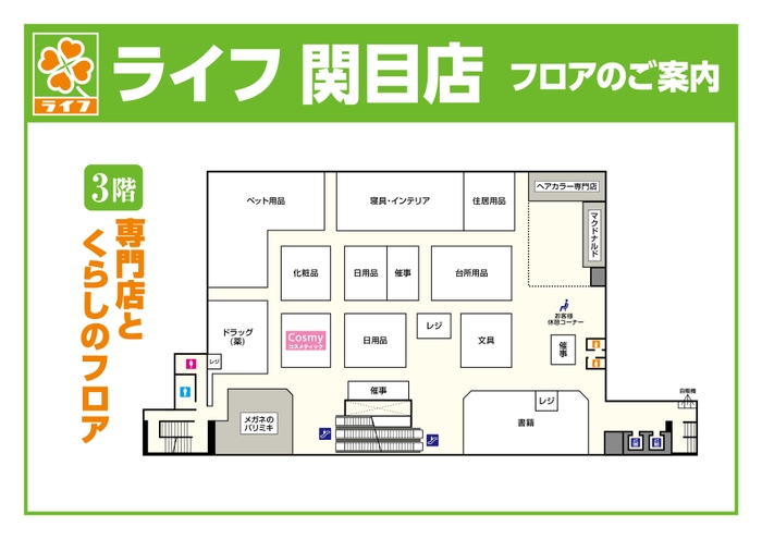 ライフ関目店限定企画として、「ハッピースタンプラリーカード」を配布しております。期間中、ライフ関目店で衣料品を1点以上お買い上げいただくと、スタンプを1個押印させていただきます。スタンプ3個で500円分のお買物券を進呈いたします。詳しくは店頭ポスターをご確認ください。