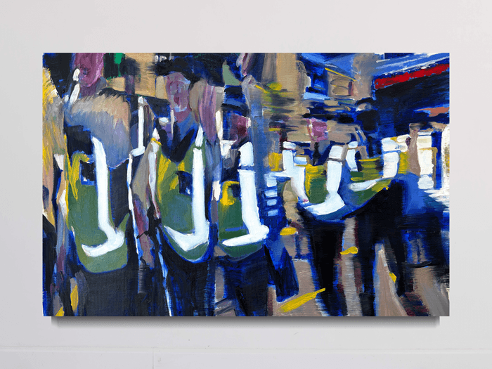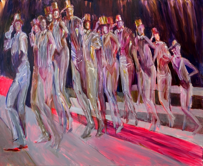 上野英里は西洋の個人主義に強い憧れを抱いており、そのため『コーラスライン』 や『ウィキッド』、『ハミルトン』などのミュージカル作品から制作のインスピレーションを得ています。しかし一方で、「誰もが特別で、あなたもその一人になれ る」という個人を称える考え方を、壊してみたいという衝動に駆られることもあります。その衝動は、「あなたは誰でもない。私たちの一員だ」という価値観が美徳とされる日本で育った経験に根ざしているのかもしれません。これは、西洋のエン ターテインメント文化とは正反対の発想と言えるでしょう。西洋的な個人主義への憧れと、日本的な集団主義の価値観とのあいだで揺れ動く中で、上野は人々が個性を失っていく瞬間に焦点を当てた絵画を制作しています。たとえば『コーラスライン』では、それぞれの登場人物が自身の物語を語ります _が、最終的にはその物語が重視されることはありません。彼らはあくまでバックダンサーとして、一糸乱れぬ動きを求められ、個性のない「誰でもない存在」となります。上野の絵画では、形の繰り返しを強調することで、ダンサーたちの人間性を剥ぎ取り、鑑賞者が彼らを個人ではなく集団の一部として捉えるような構成を試みています。