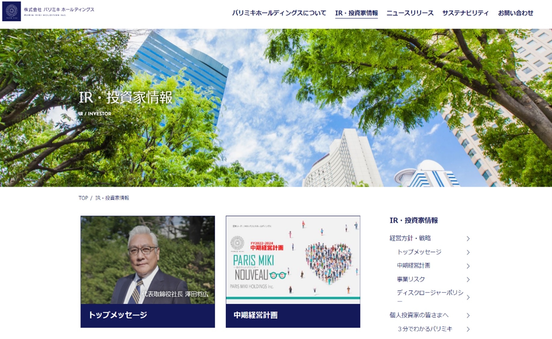 なお、サステナビリティページの開設と同時に、「IR・投資家情報」ページにつきましても、コンテンツの拡充および刷新を行いました。(ページURL:https://www.paris-miki.com/hd/investor/)