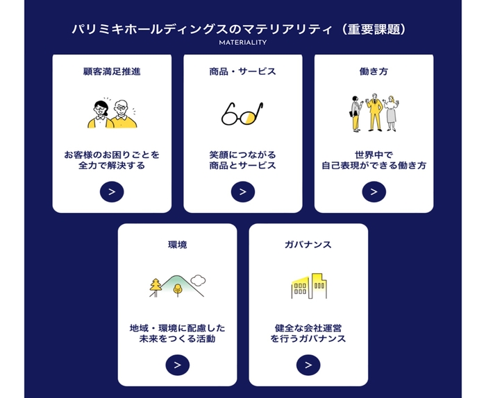 パリミキグループでは、特に優先的に取り組むべき重要課題(マテリアリティ)を、以下の5つに定めており、これらの内容と取り組みについて、サステナビリティページでご説明しています。